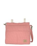 La bolsa minibag de La Giraffa Bianca e Blu está confeccionada en tejido algodón 100% blanco y está forrada por dentro en tejido impermeable. Además, incluye cuatro bolsillos organizadores y tiras con clics a presión para poder colocarla en cualquier carrito o silla de paseo del mercado.