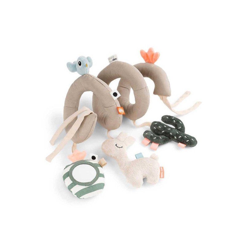 La espiral de actividad flexible se puede sujetar a la cuna, al asiento del coche, al cochecito o incluso al brazo de la mamá. Un entretenimiento perfecto para llevar.